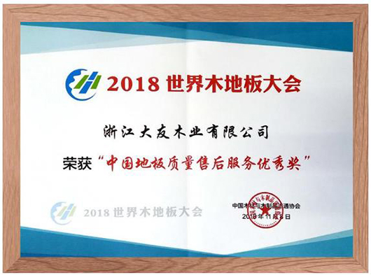 11月8日,2018世界木地板大会暨第五届南太湖论坛隆重召开,来自行业协会的专家学者及全球知名地板企业负责人同聚一堂,共同探讨全球木地板行业发展形势。在所有参会人员的见证下,大会进行了隆重的颁奖盛典,大友地板在众多地板品牌中脱颖而出,荣获中国地板质量售后服务优秀奖,还因积极参与“中国(湖州)地板产业发展指数”数据采集工作,为地板行业发展做出贡献而获得表彰,品牌实力及行业影响力再获肯定。