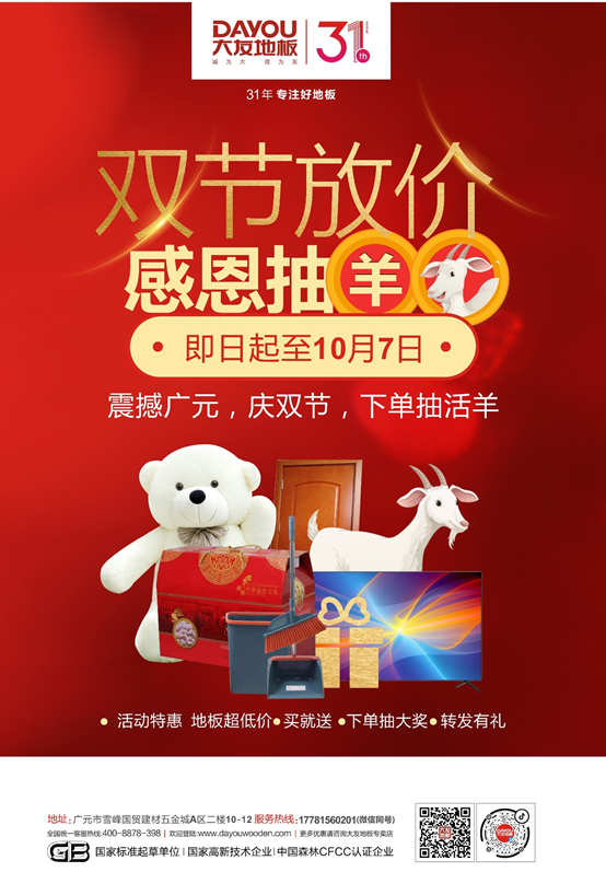 有句话是这么说的:“拿下打折季,净赚一个亿”用更少的钱,买到更实惠的地板近日大友地板广元店实力宠粉双节大促,好价震撼来袭