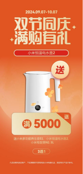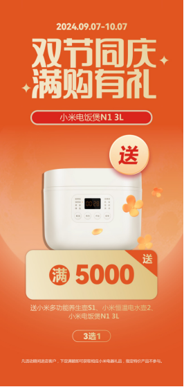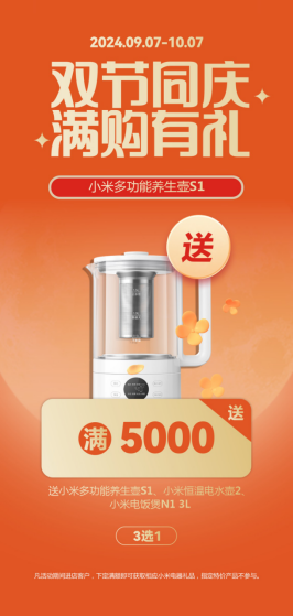 满5000,送小米多功能养生壶S1、小米恒温电水壶2、小米电饭煲N1 3L(任选其一)