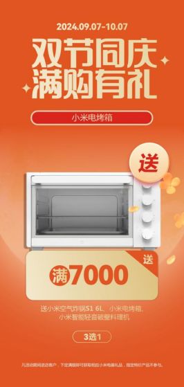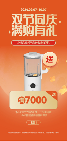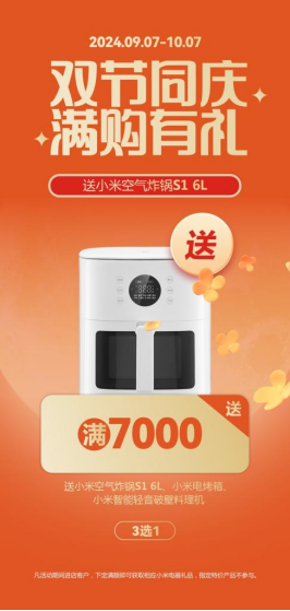 满7000,送小米空气炸锅S1 6L、小米电烤箱、小米智能轻音破壁料理机(任选其一)