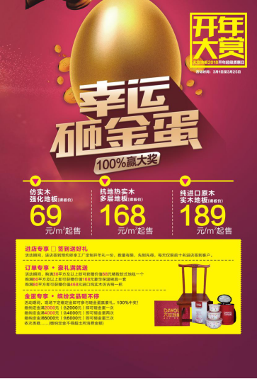 秉持着回馈全国各地消费者的原则,大友地板每一次的让利活动,都持优质而实惠的地板产品与大家见面,这次也不例外。我们依然为大家带来一场狂欢盛宴,所有促销地板产品一律为出厂价,除此之外,还有纯实木仿古椅、保温餐具、精致地毯、砸金蛋等等豪礼等着你,下单越多,优惠力度越大。