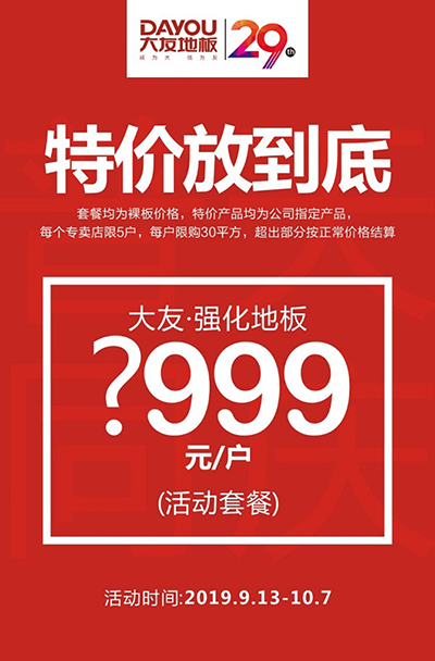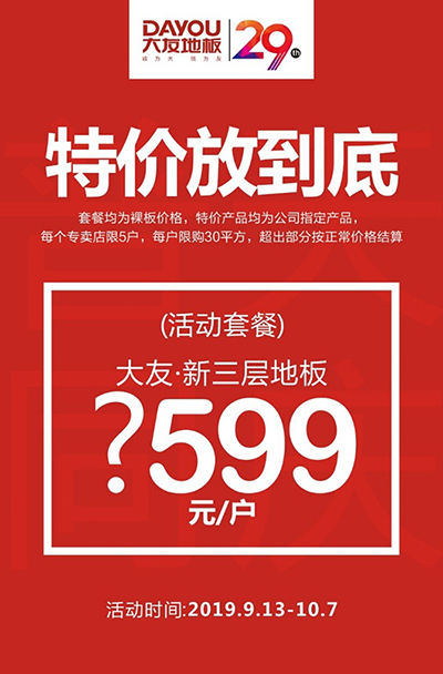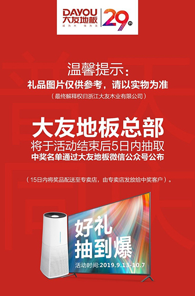 大友地板早早把活动安排上了,“国之大庆·盛惠九洲”活动正式上线,想挑好地板,就来大友地板!