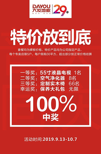 凡活动期间下单,并交满定金3000元以上,即可参加大友地板总部抽奖活动,每户仅限一次,100%中奖率。