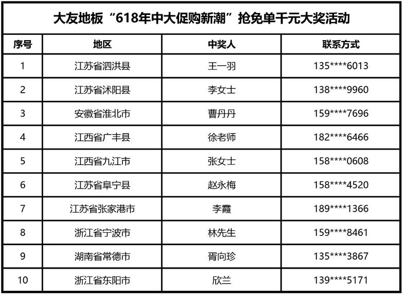 大友地板“618年中大促购新潮“抢免单千元大奖抽奖活动,通过大友地板官方抖音平台的直播,在所有消费者的见证下,抽取了本次活动的获奖名单。本次抽奖真实、有效,特在此公布,具体名单如下表: 请各位中奖者前往当地大友地板专卖店领取对应礼品