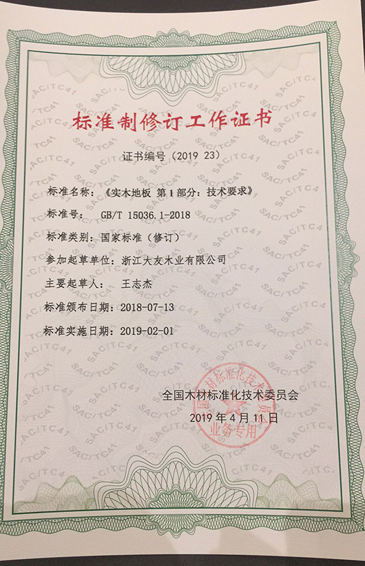 2019年,是一个全新的挑战。每一次标准的起草与制定都顺应了市场的发展、消费升级的需要。这有助于提升中国地板行业的研发、制造技术,有利于促进产业规模有序、健康、规范发展。今后,大友地板将再接再厉,积极参与行业各项工作,为推动中国地板行业整体进步发挥先锋模范带头作用!